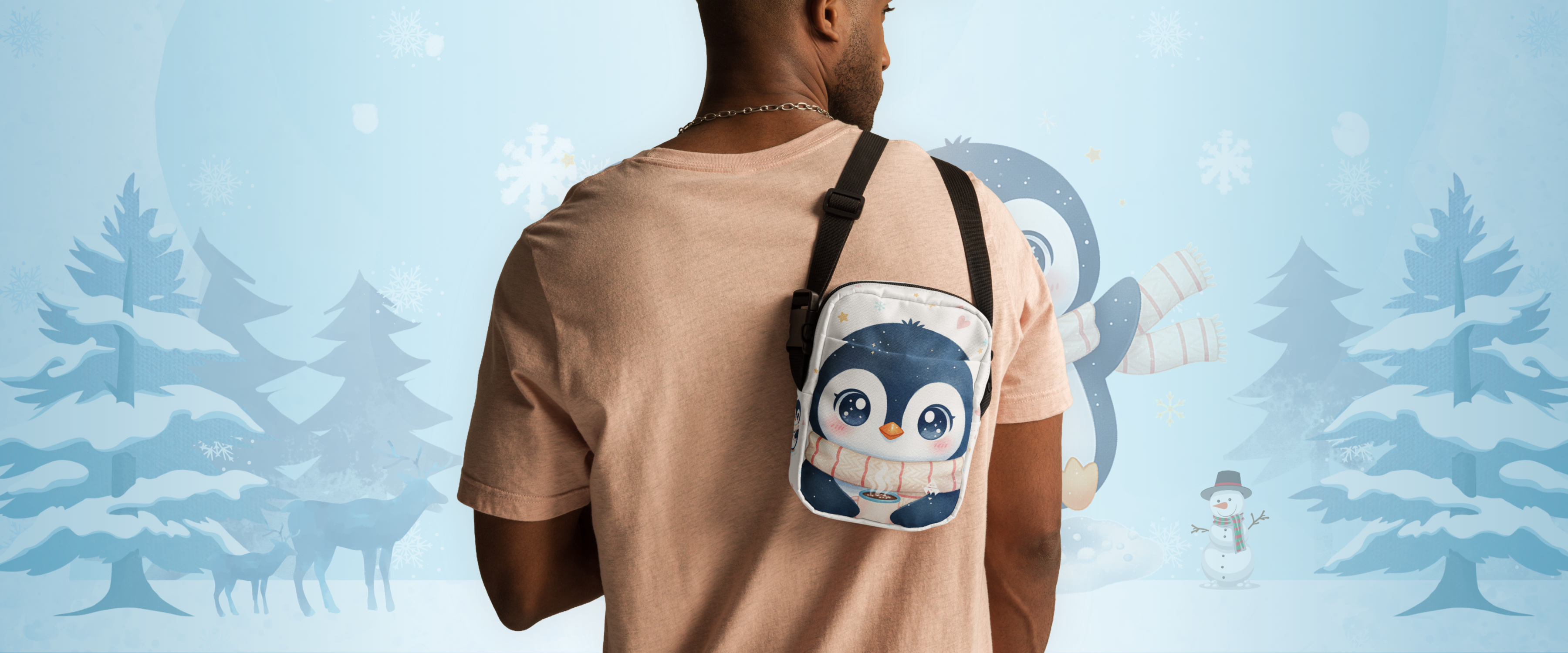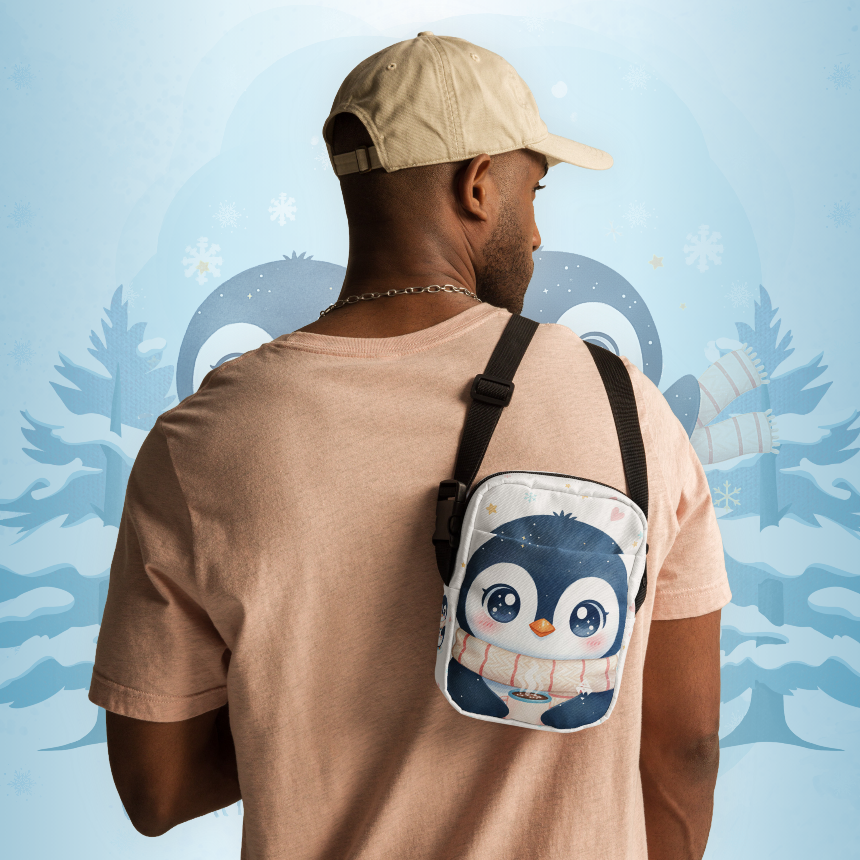 Frosty Hug Crossbody is inspired by the poetry of winter — slow mornings, warm hands, and quiet moments wrapped in calm. The penguin baby, gently holding a cup of warmth, symbolizes comfort in the cold and softness in stillness. A design created to evoke emotion, not just style.